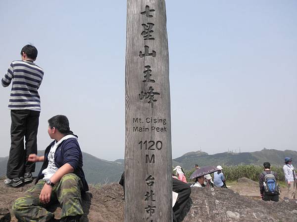 再回到爬七星山的道路,之後這一段路途稍稍平緩一些,且在 1200m 處與兩隻松鼠不期而遇,不過只有短暫的交會,便又各自踏上不同的旅程,接下來要開始攻頂 所以又是可恨的爬梯,東峰步道極少遮蔭,而且相當陡峭,所以天氣好時烈日當空、天氣壞時又冷颼颼,但也因如此視野很好,在這次我會了很多全景的拍攝,讓大 家可以俯瞰整個台北市,到了七星山東峰,有編號1104的三角點,對面可看到還有一個高峰,就是七星山主峰海拔1120公尺,此地有一等衛星控制點,在七 星山主峰稍作休憩 居高臨下,眺望台北市,七星山主峰 可從三個登山口上來,苗圃、小油坑、冷水坑 登山口,所以下山時走的是小油坑的路線,路程1.6公里。