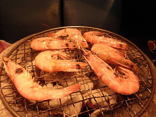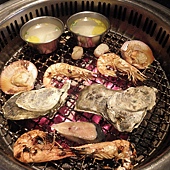 霜降牛、 牛五花、豬梅花肉、煙燻培根、蒲燒魚腹、炙燒魴魚、烤蝦。