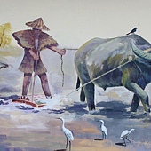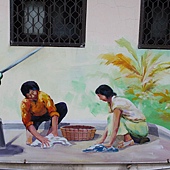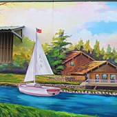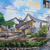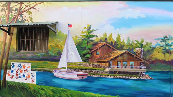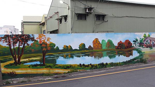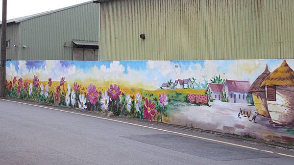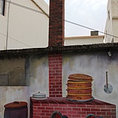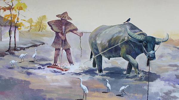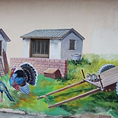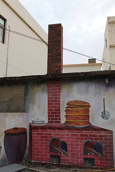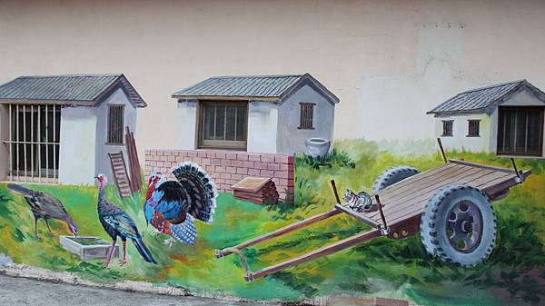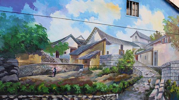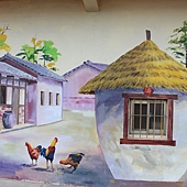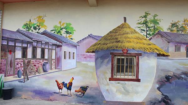 坑口彩繪村主要以50年代的農村背景為主,重現早期農村生活,可以看到爐灶、蒸籠、煙囪等充滿古早味的廚房用品,還有水牛、雞、鴨等生動寫實的描繪,感受一下當個農夫或農婦的鄉村風景。