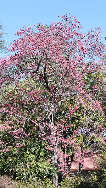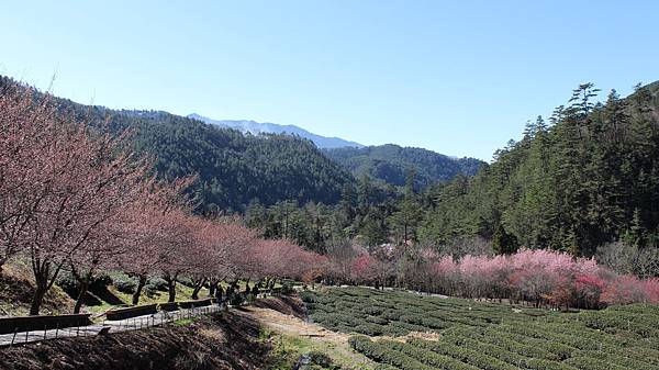 武陵茶莊對面櫻花林步道的觀月亭,若櫻花盛開時,從觀月亭可以望到一整片粉嫩波浪的櫻花林。
