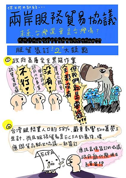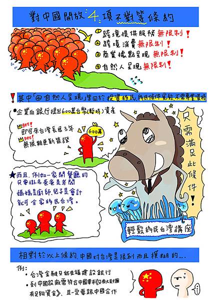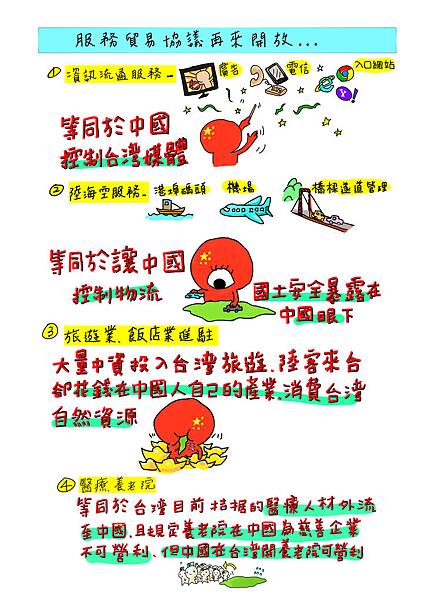 3. 我們開放大陸進來的同時,但台灣到大陸卻受到種種限制,面對這種不公平的貿易條例,這麼模糊不清的服貿,這根本就不是什麼公平開放、競爭,別人擺明要陰你,你還要很高興接受,支持這種不公平的貿易條例,背後是有麼目地,就不得而之。