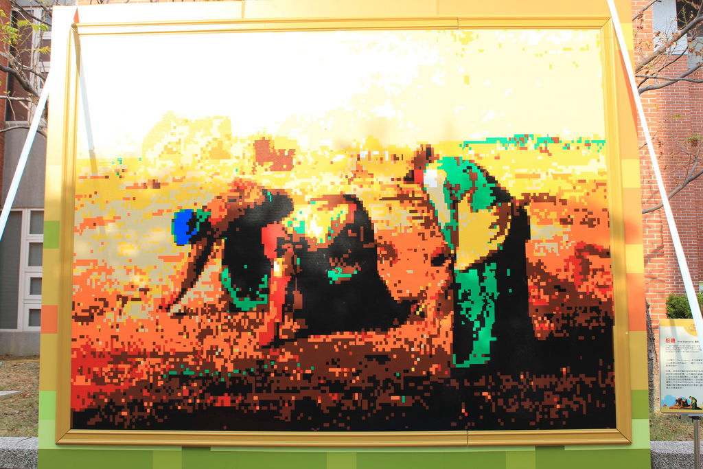 2014新竹藝動節,將米勒《拾穗》使用大量積木拼貼營造名畫氛圍,使用近十萬顆的積木,雖然將整理顏色與線條馬賽克化,並以簡單的九種顏色積木堆疊與拼 貼表現知名的寫實主義畫作「拾穗」, 但仍不失原畫作中各種與光影變化等細節, 在此特別感謝新竹玩樂高手積木團隊共同協助製作。