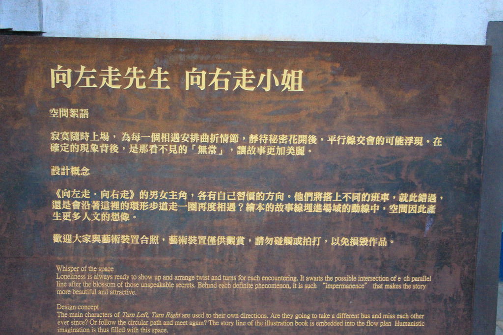 廣場以「記憶片刻風景」為主題,現場的裝置藝術全取自知名繪本作家「幾米」的作品,繪本「向左走‧向右走」中的男、女主角往各自方向走去的場景;繪本「星空」裡的小男孩與小女孩一起等公車上下學場景,也出現在廣場路旁。