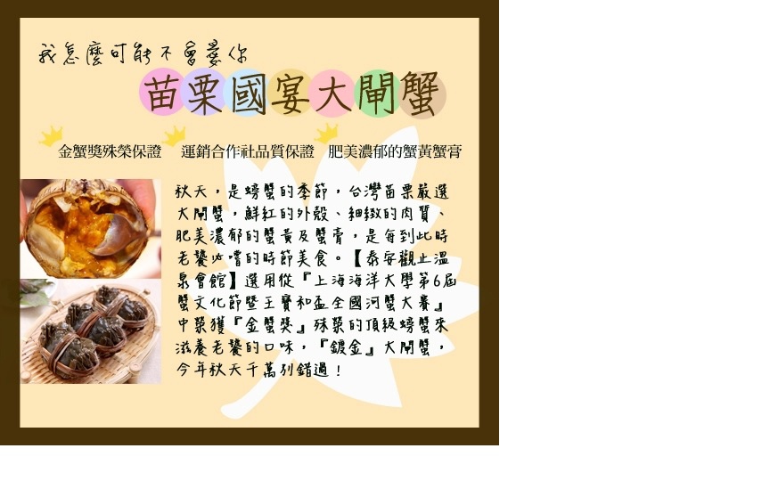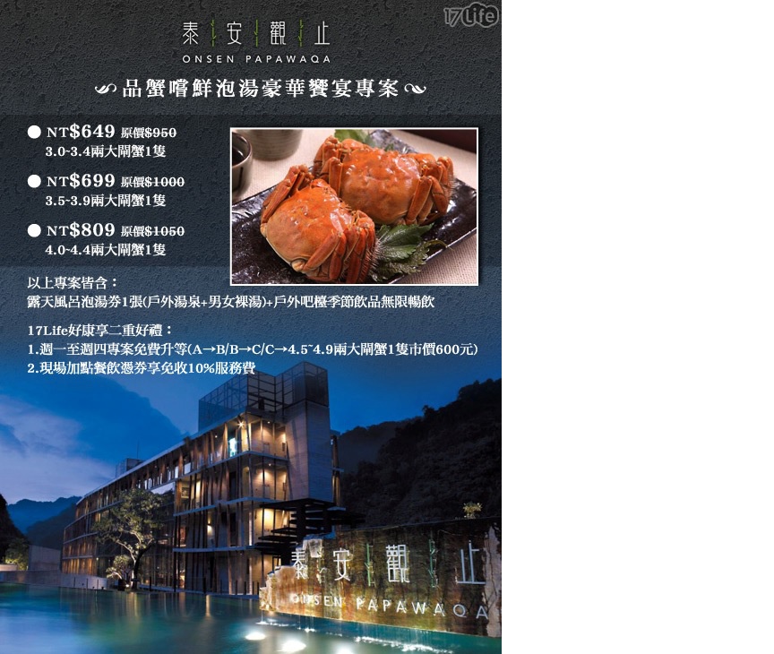 之前只要去泰安泡溫泉時,總會經過泰安觀止,一直很想去當大爺享受一下,這次剛好有品蟹嚐鮮泡湯 豪華饗宴專案,能品嘗大閘蟹順便泡湯。