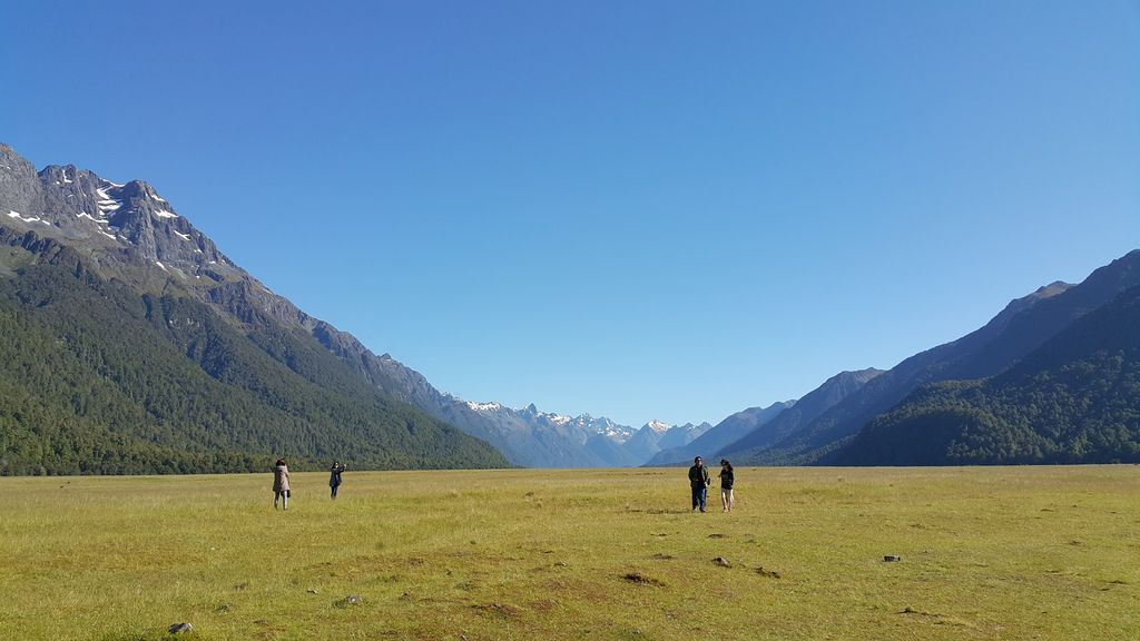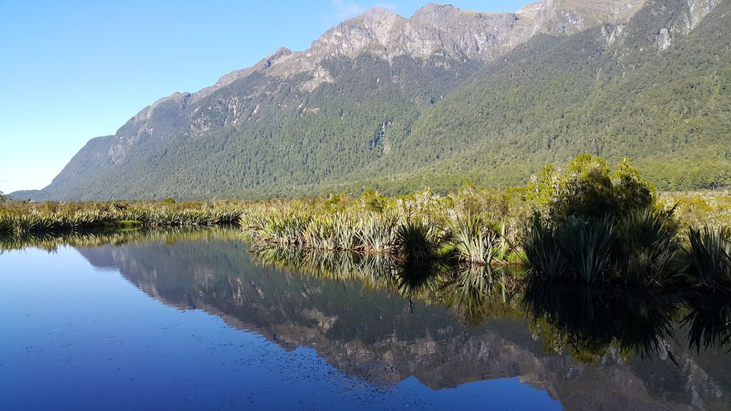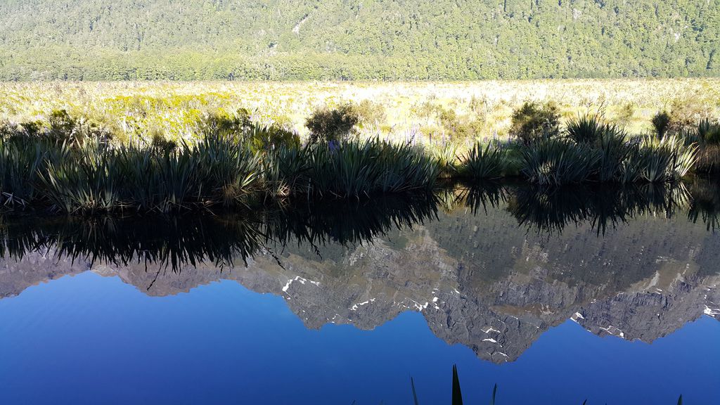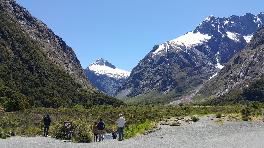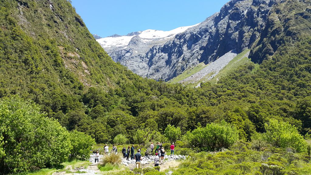 紐西蘭最大、世界排名第五的Fiord land National Park「峽灣國家公園」,毛利語稱米佛峽灣為PIOPIOTAHI,佔地面積達125萬公頃於1986年已被授予世界遺產區。沿途行車欣賞峽灣國家公園內的壯麗景緻,通往峽灣的道路兩旁覆蓋著紐西蘭原始冷溫帶雨林,其中主要樹種是銀山毛櫸,專車行經峽灣國家公園內最大的天然草原-埃格林頓山谷Eglinton valley、鏡湖Mirror Lake、諾布斯平原Knobs Flat、全長1.27公里的荷馬隧道Homer Tunnel等,午間抵達Milford Sound米佛峽灣