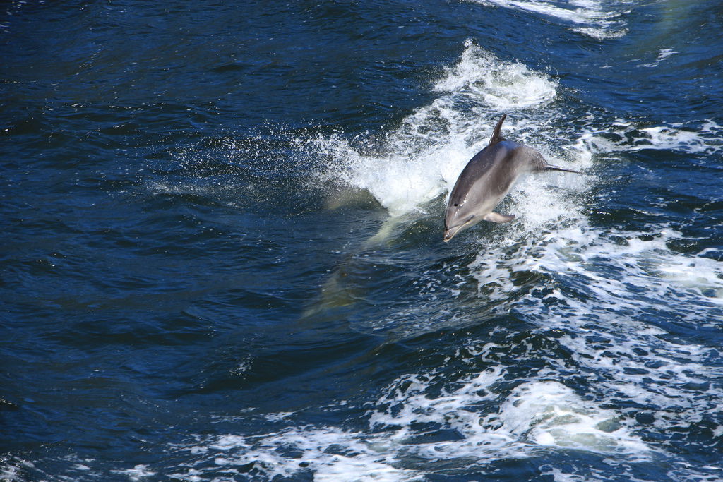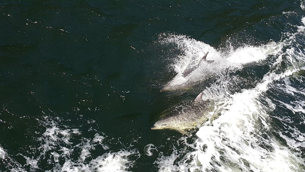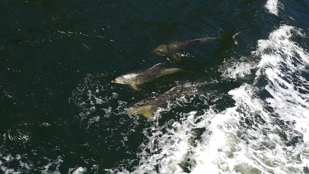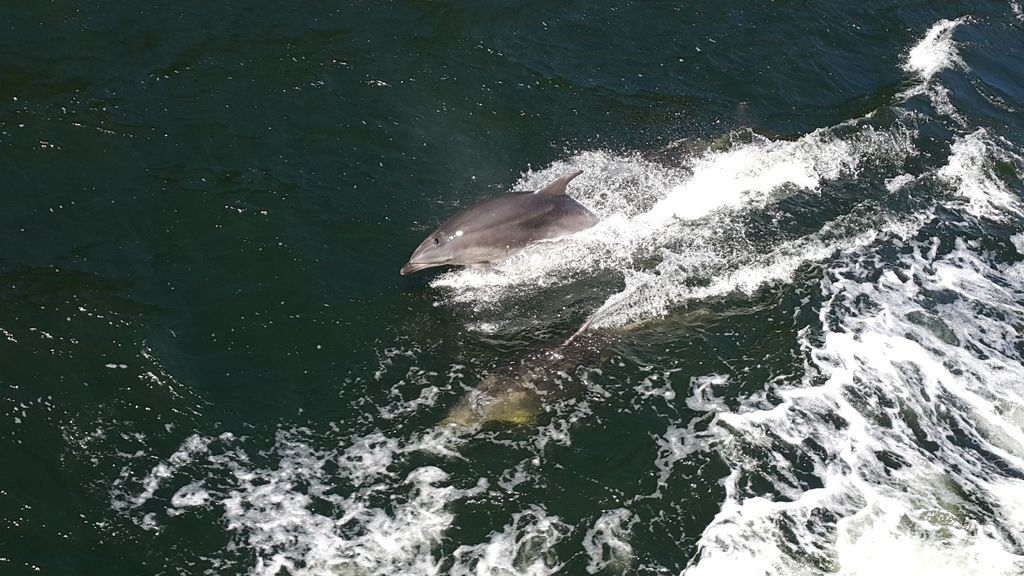 , 有時可看見 一群群的「凸吻海豚」 伴隨左右