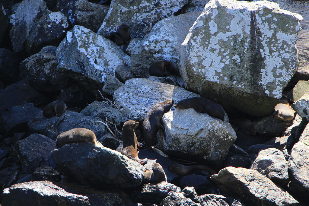 紐西蘭軟毛海豹,懶洋洋躺在岩石上曬日光浴。