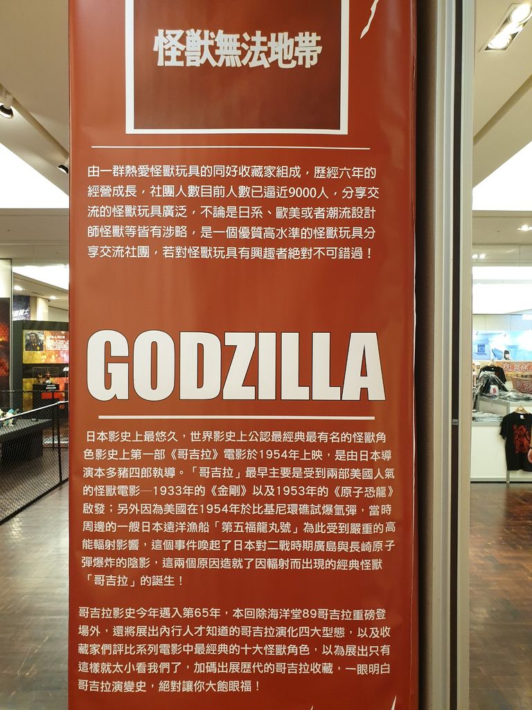 展出從1954年 第一部 哥吉拉電影上演,到 2019 歷代哥吉拉,還有 哥吉拉當中最經典的十大怪獸角色。 真的太威了 。