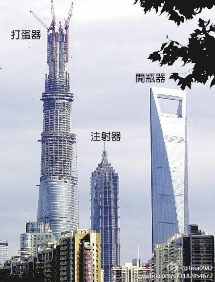 如上圖所示 (之前上海中心大厦未完成時像 打蛋器 現在已經不像了)